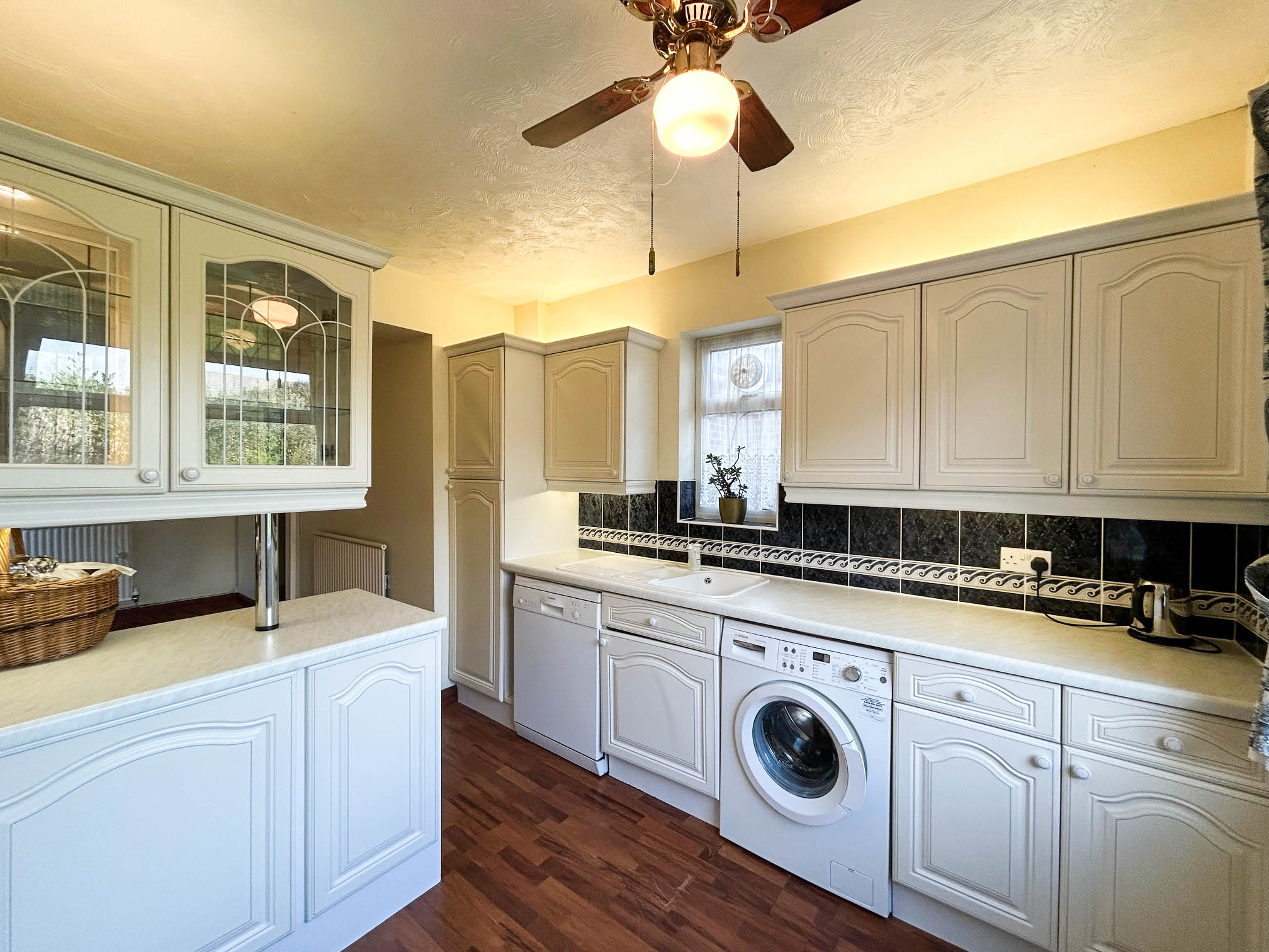 Range of units incorporating drawer and cupboard fitments, inset sink unit, space and plumbing for appliances, fitted eye level wall cupboards, peninsula unit with drawers and cupboards beneath, glazed display cabinet above. Integrated four burner ceramic hob, split-level double oven with storage above and below. Two radiators. Door to side access.