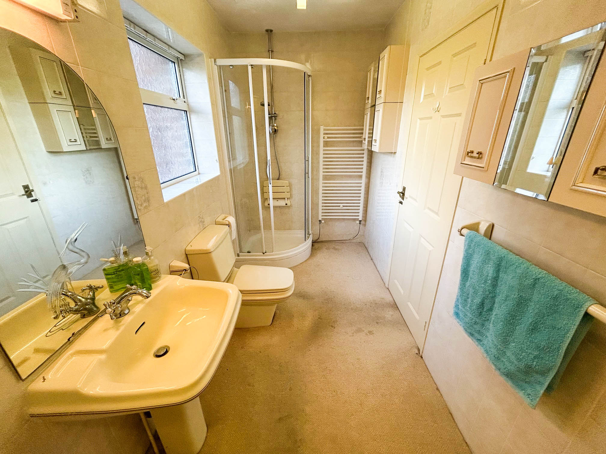 Of good size and comprising panel bath, wash basin with mirror over, WC, corner entry shower, towel radiator, ceramic tiling to walls, light/shaver point.