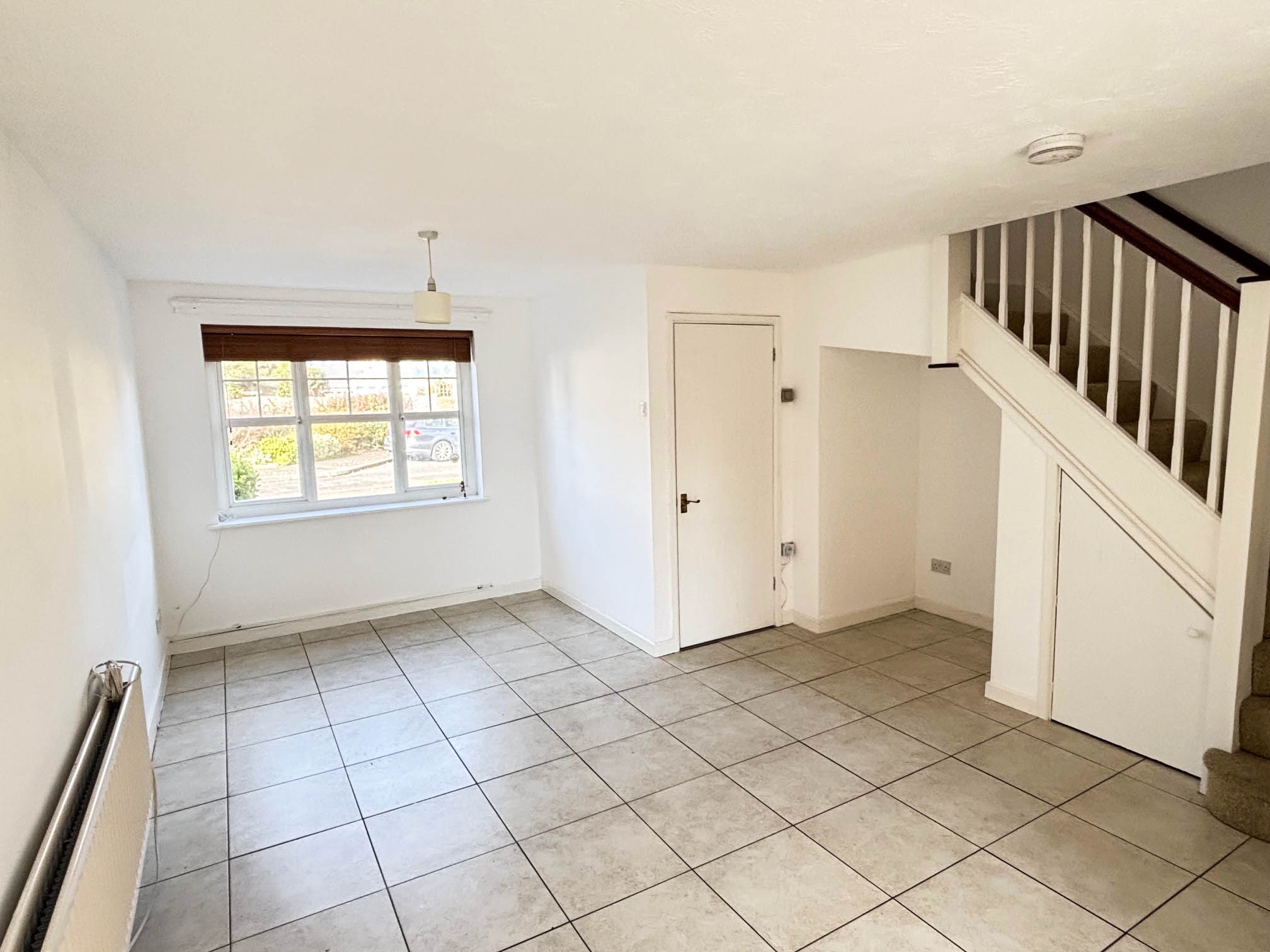 A bright double aspect room with sliding patio doors leading to rear garden, three radiators, under stairs storage cupboard, arch opening to