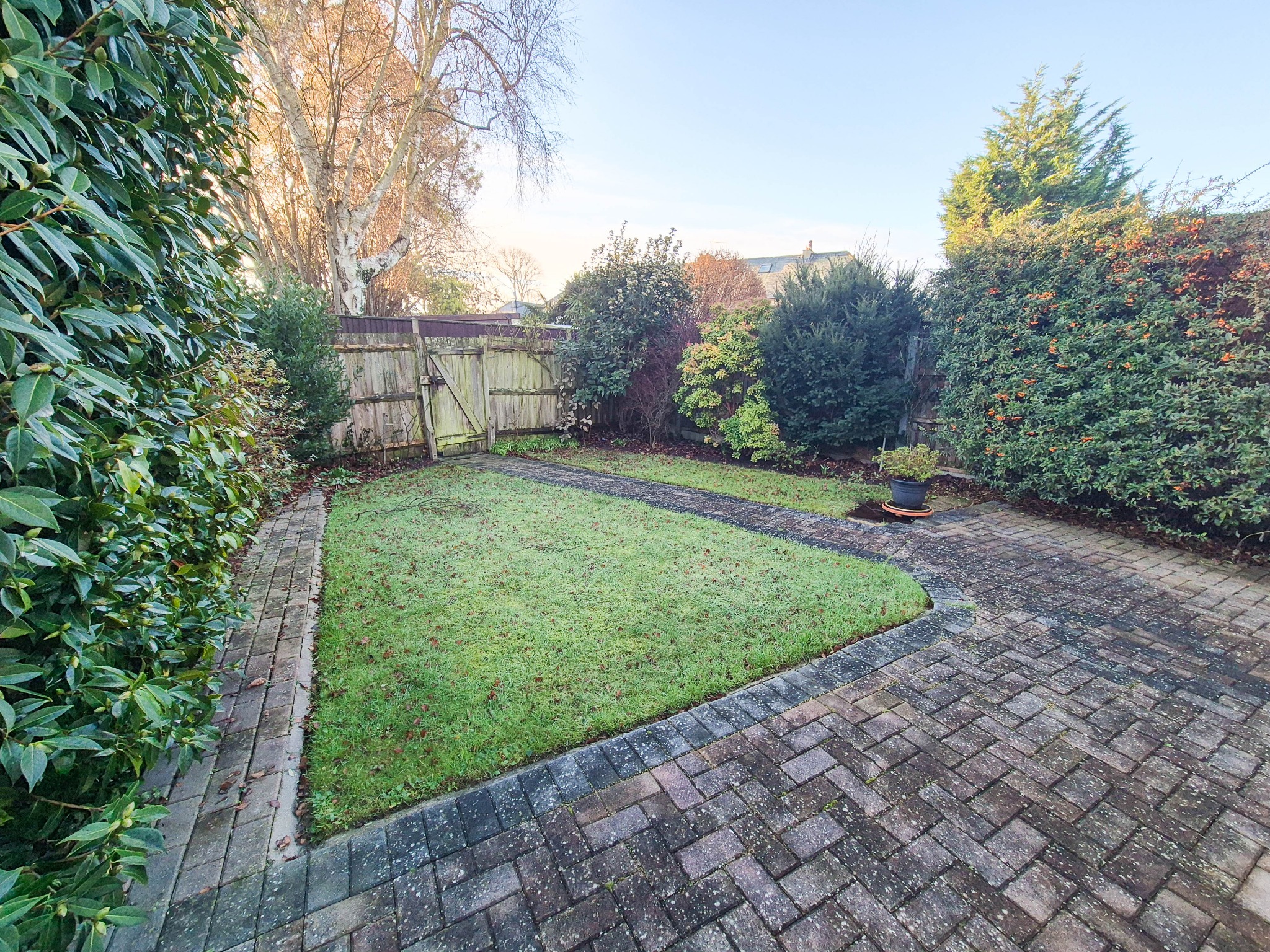 The front garden is of open-plan style, whilst the garden to the side and rear is enclosed, with brick paved terrace and associated pathways and offers a high degree of seclusion with gated rear entrance. Adjoining the property is a lean-to green house/store plus timber garden shed. Located nearby is a