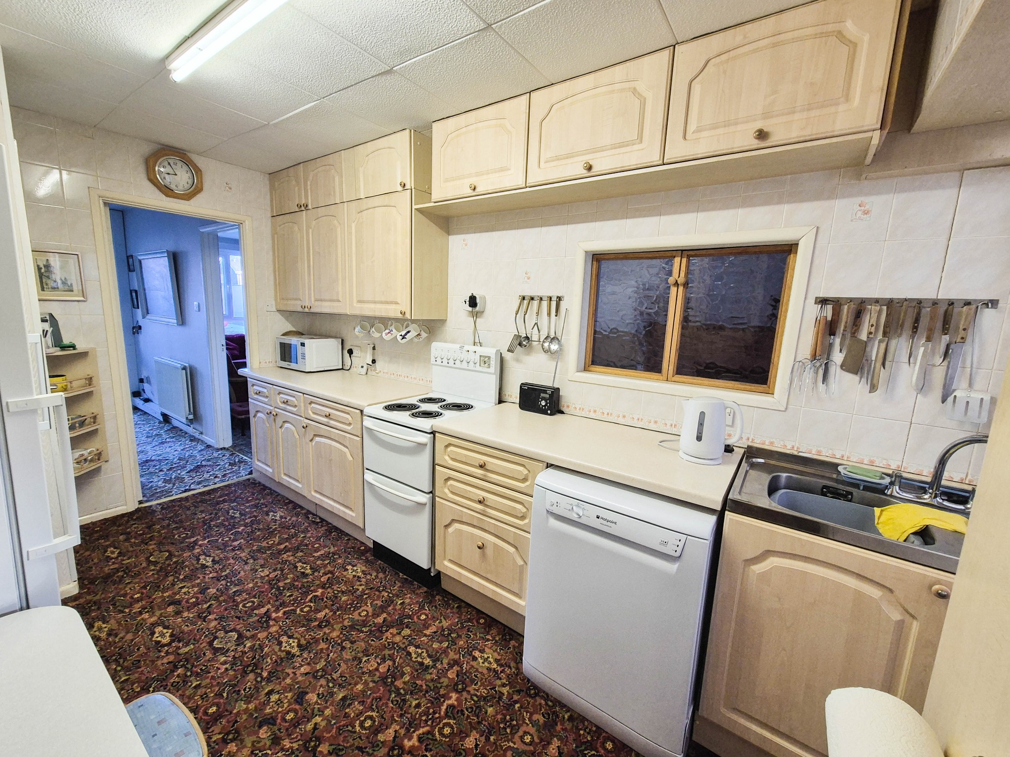 Comprising twin bowl stainless steel sink unit with cupboards under, space and plumbing for washing machine and dishwasher to either side, further work surfaces with drawer and cupboard fitments, fitted eye level wall cupboards, under stairs storage cupboard, radiator, access to conservatory, further door to