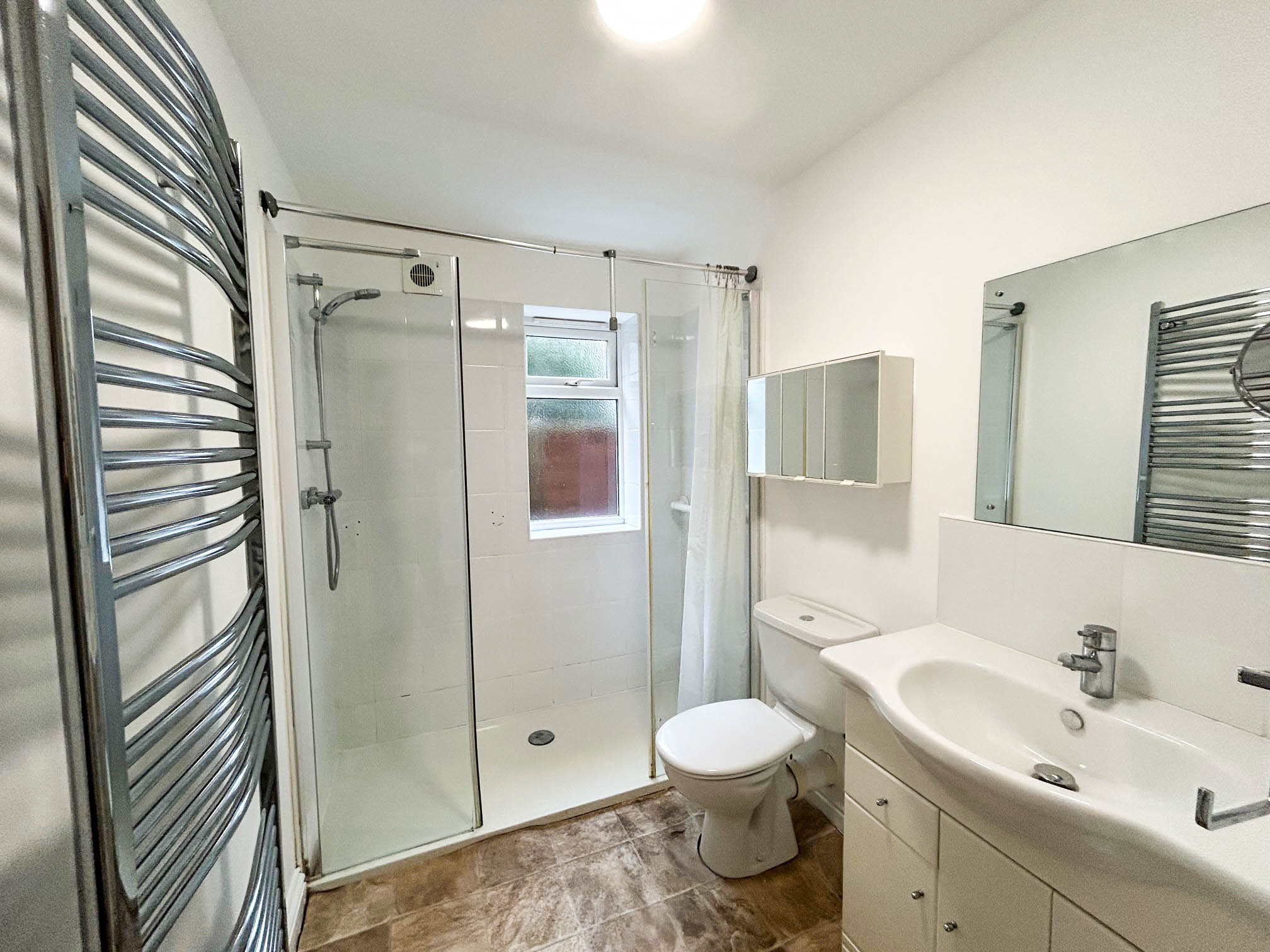 A modern suite comprising fully tiled, large walk-in shower cubicle, fitted thermostat control shower unit, vanity wash basin with cupboard beneath and tiled splash back, mirror fronted cabinet, WC, extractor vent, towel radiator, storage cupboard.
