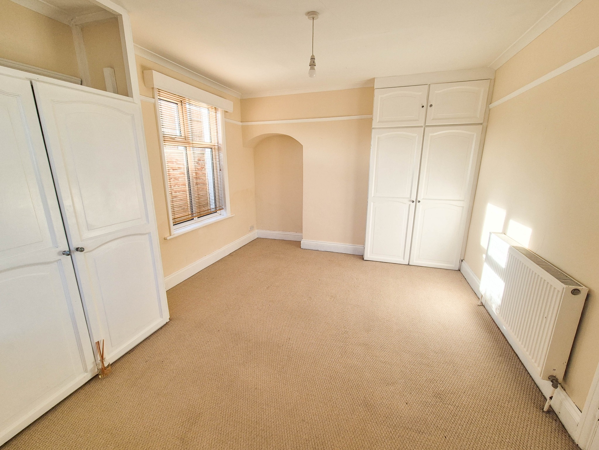 Two sets of fitted wardrobe cupboards, radiator.