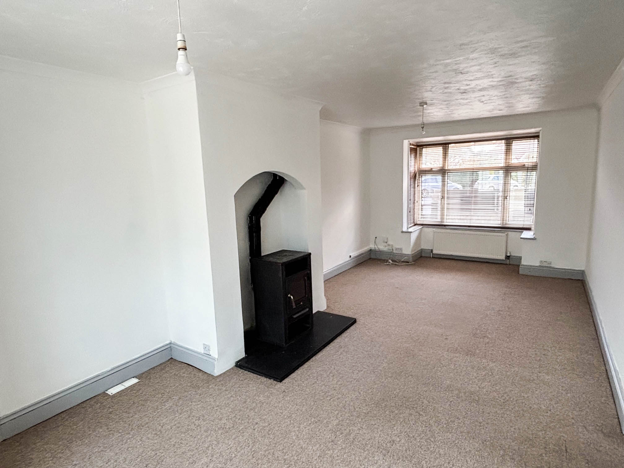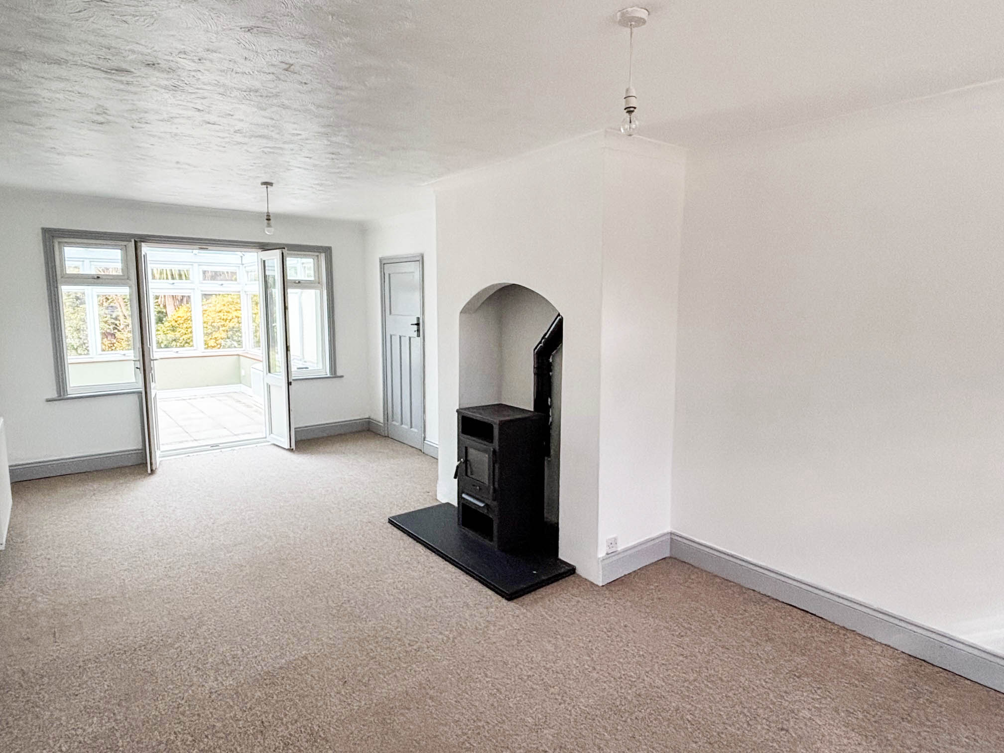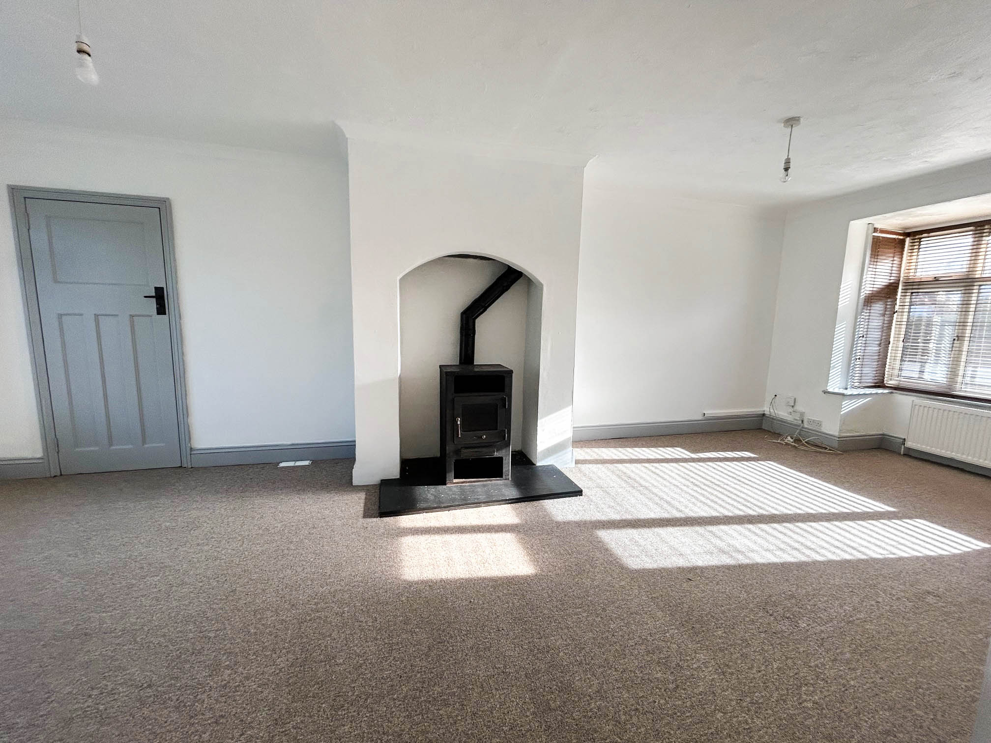 Two radiators, raised hearth with wood burner, door to