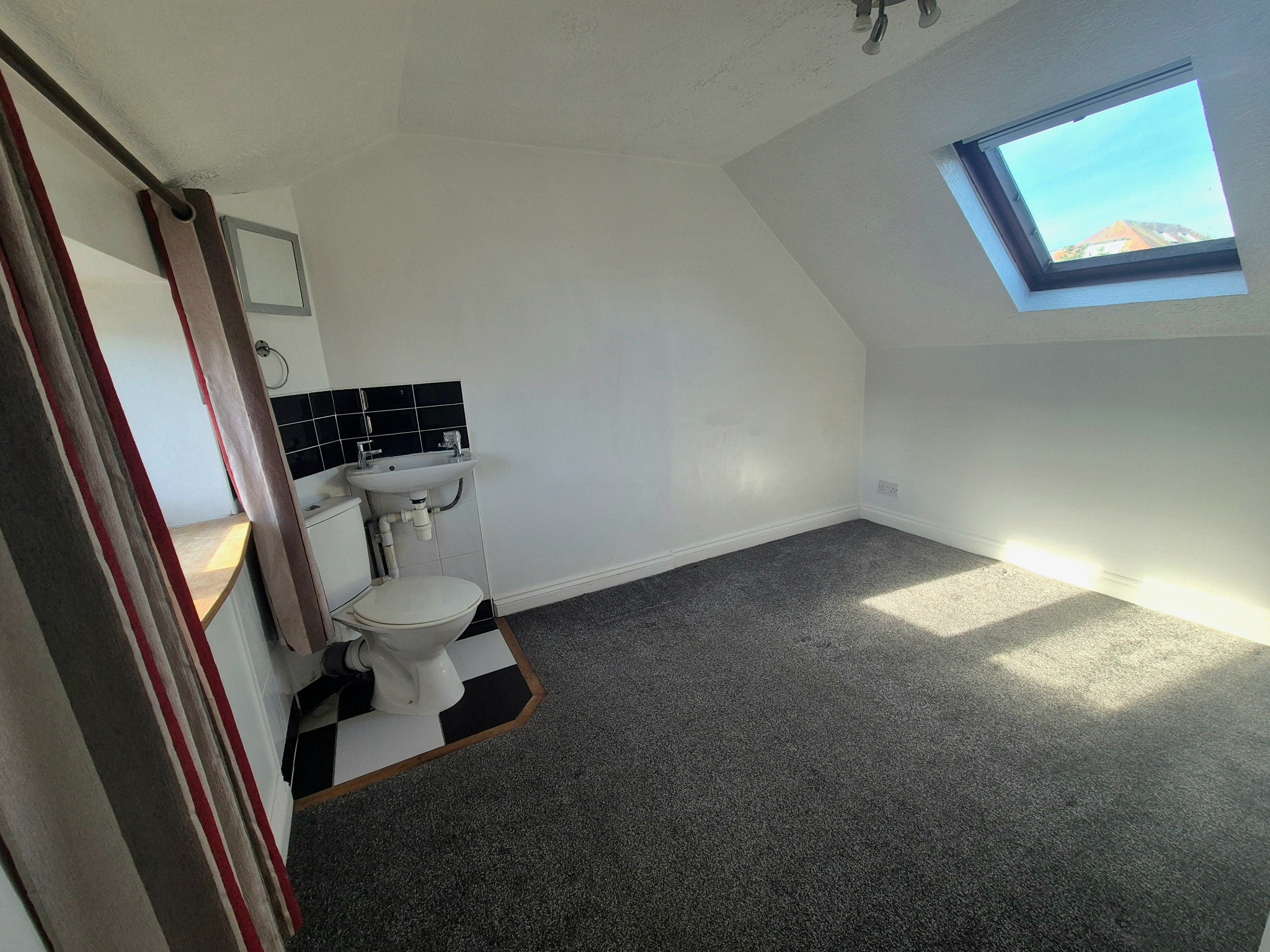 Radiator, access to storage. WC with wash basin and tiled splash back.