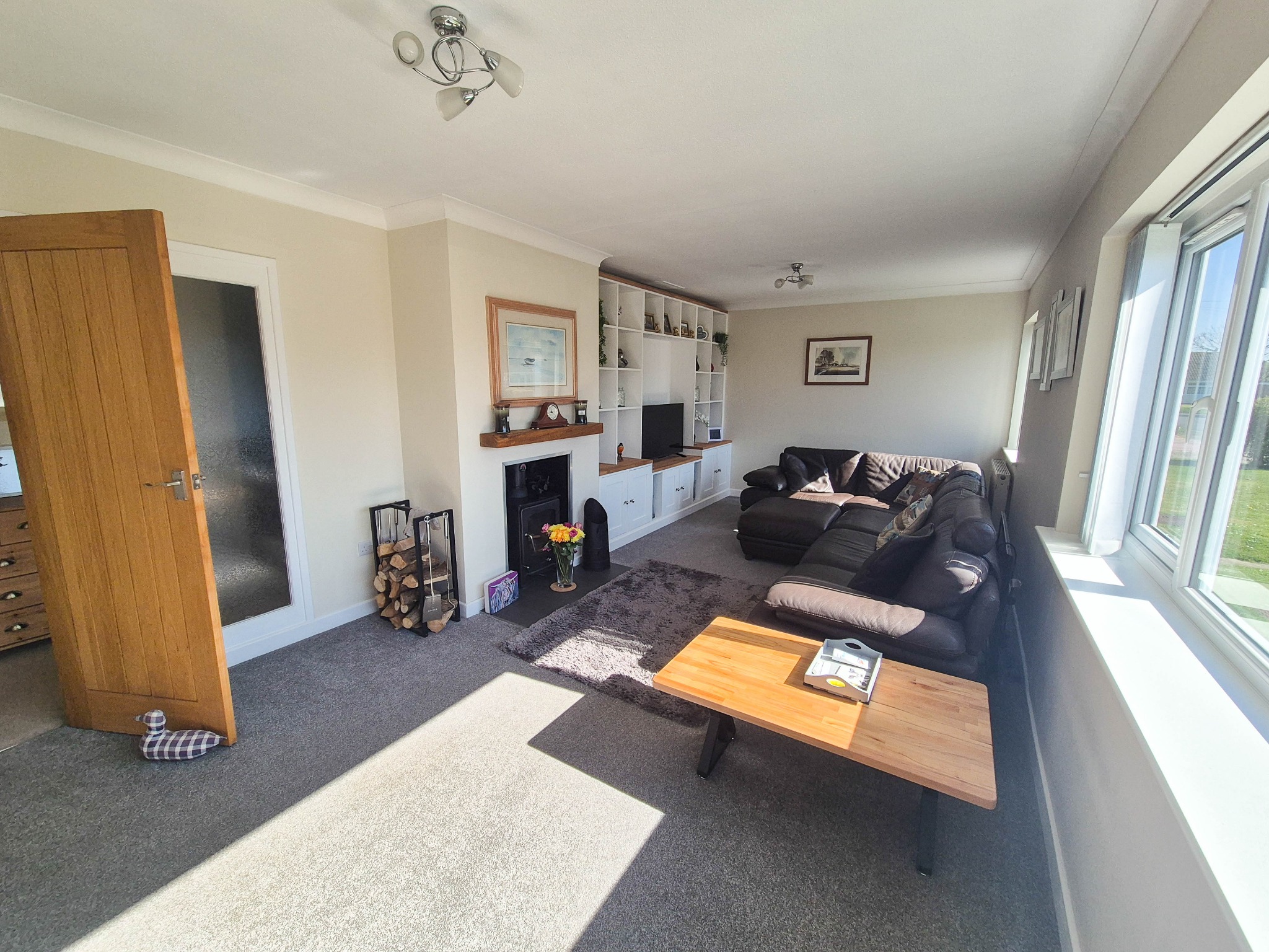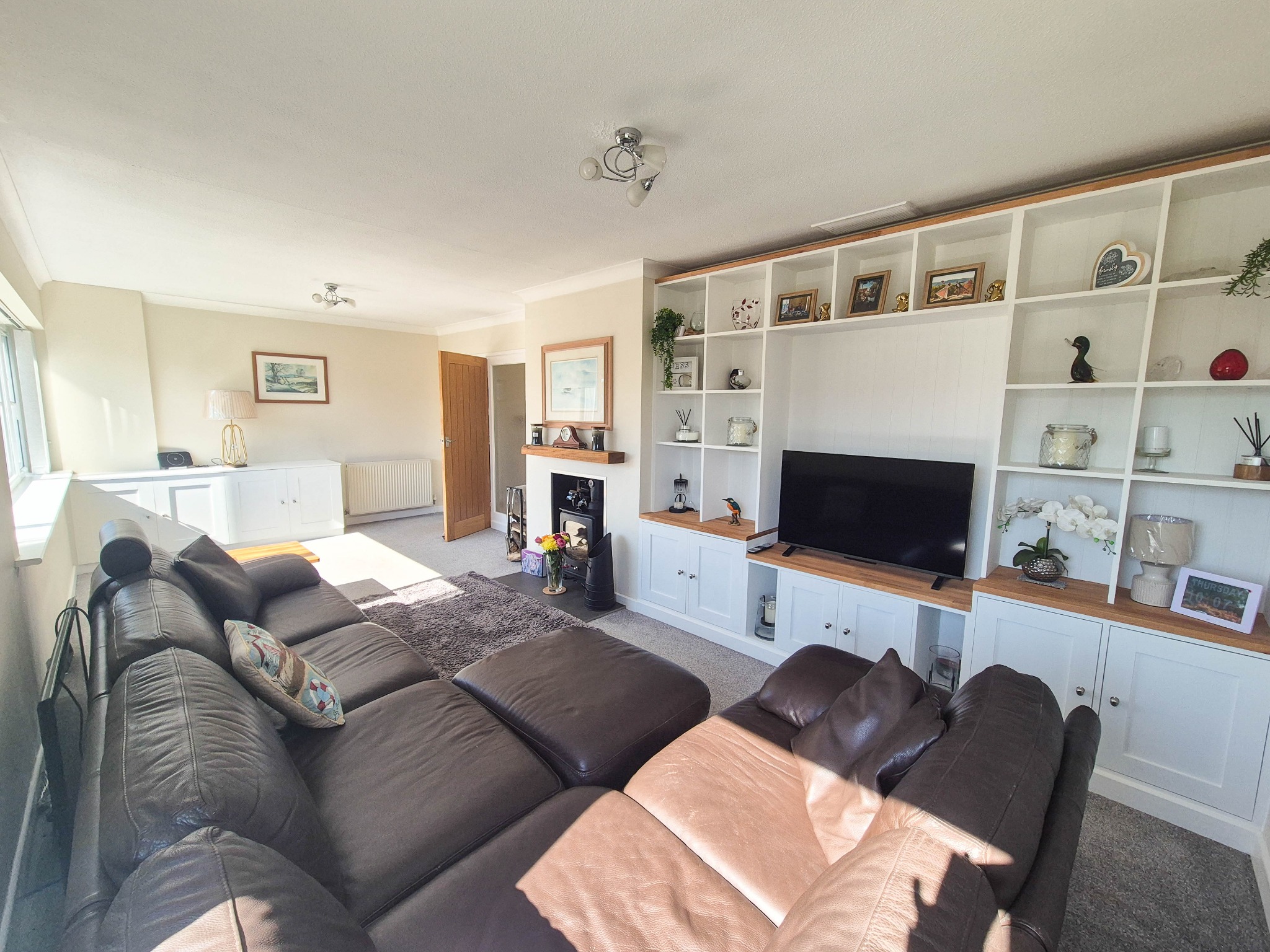 A bright, light room, fitted log burner with oak mantle over. Feature wall unit incorporating storage cupboards and display shelves with TV space. Further fitted storage cupboards. Two Radiators.