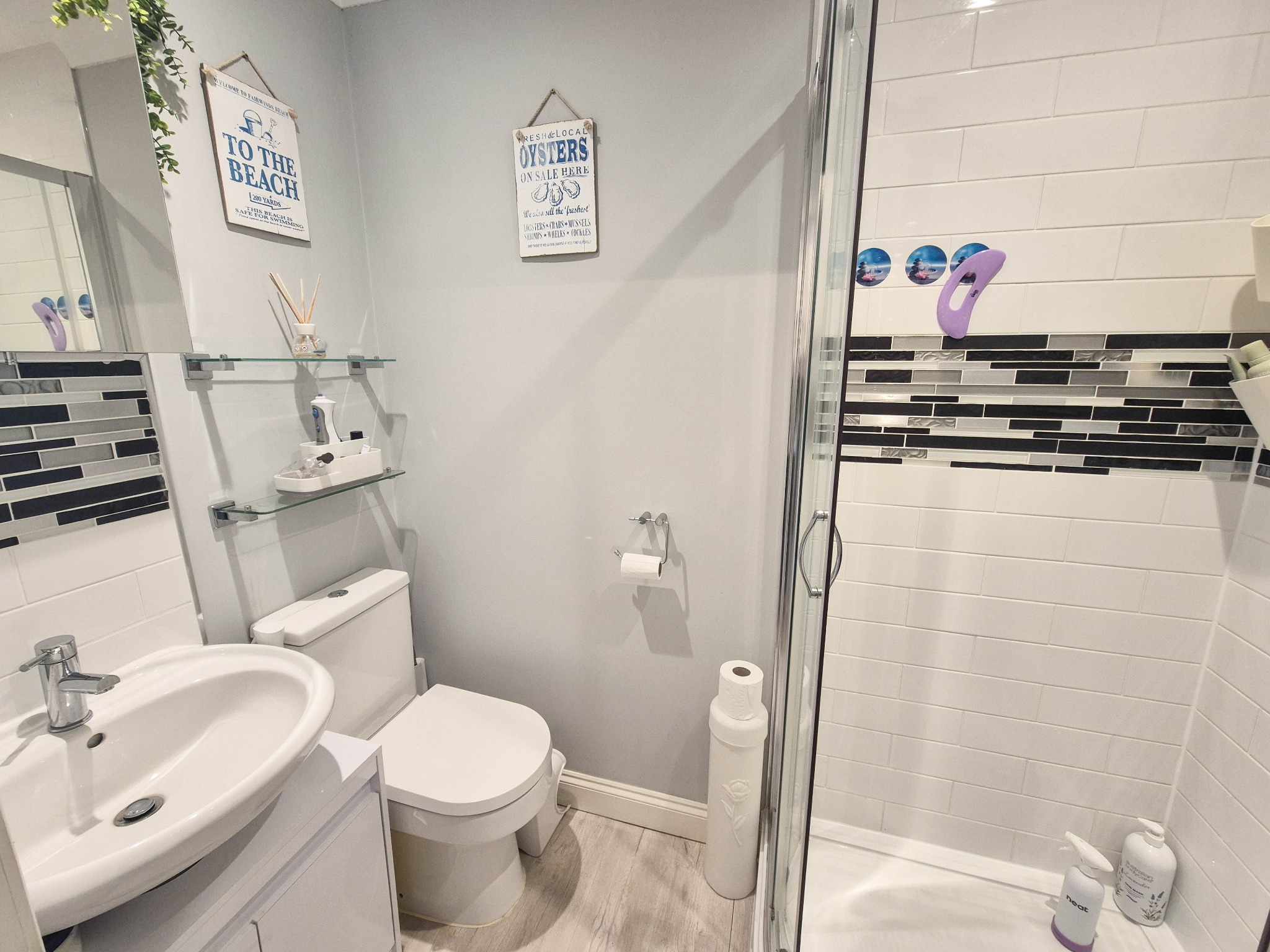 Comprising corner entry shower cubicle with fully tiled surround, wash basin, WC, tiled splash back, extractor vent.