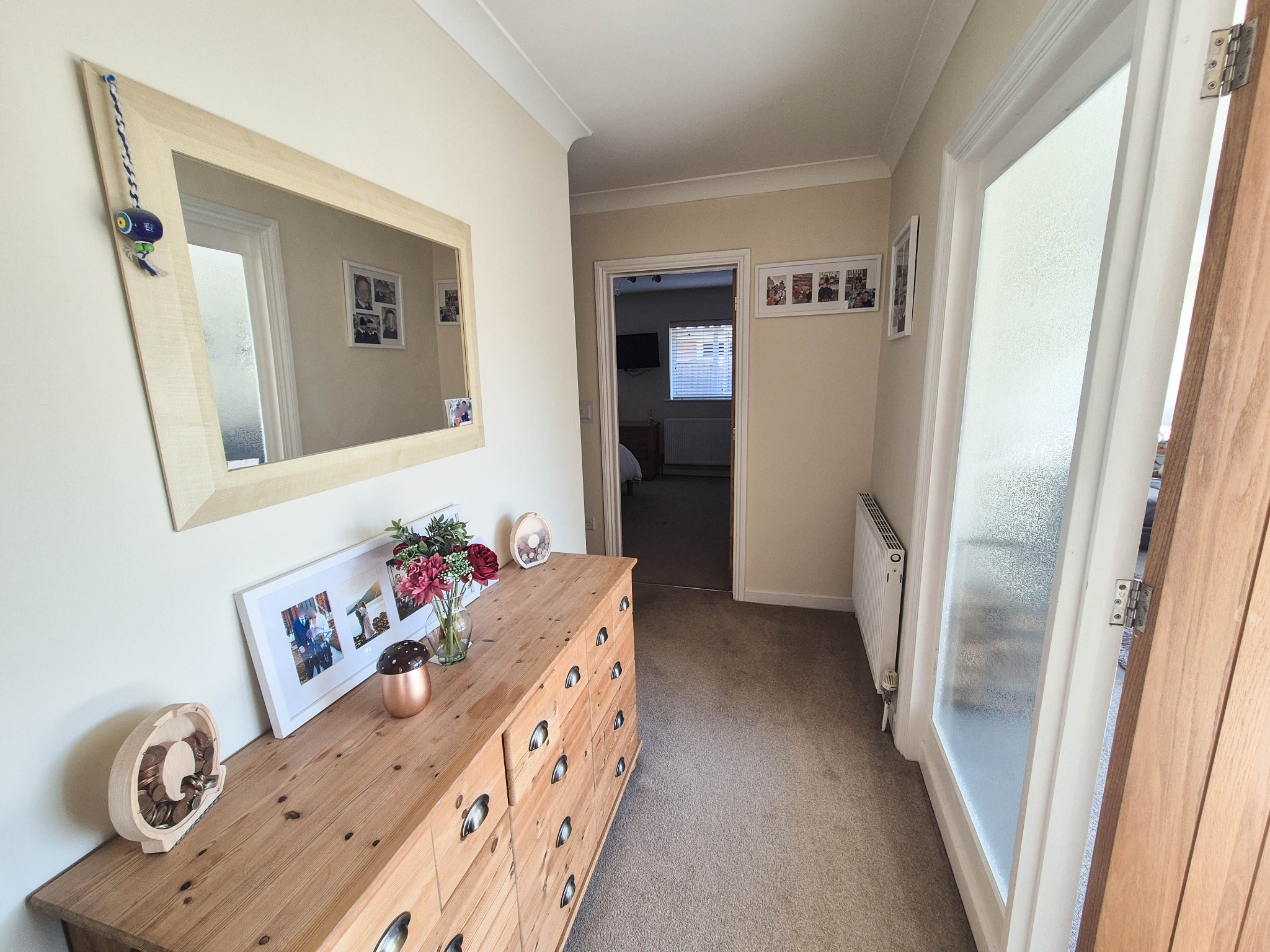 Radiator, access to roof space via swing down ladder, shoe cupboard.