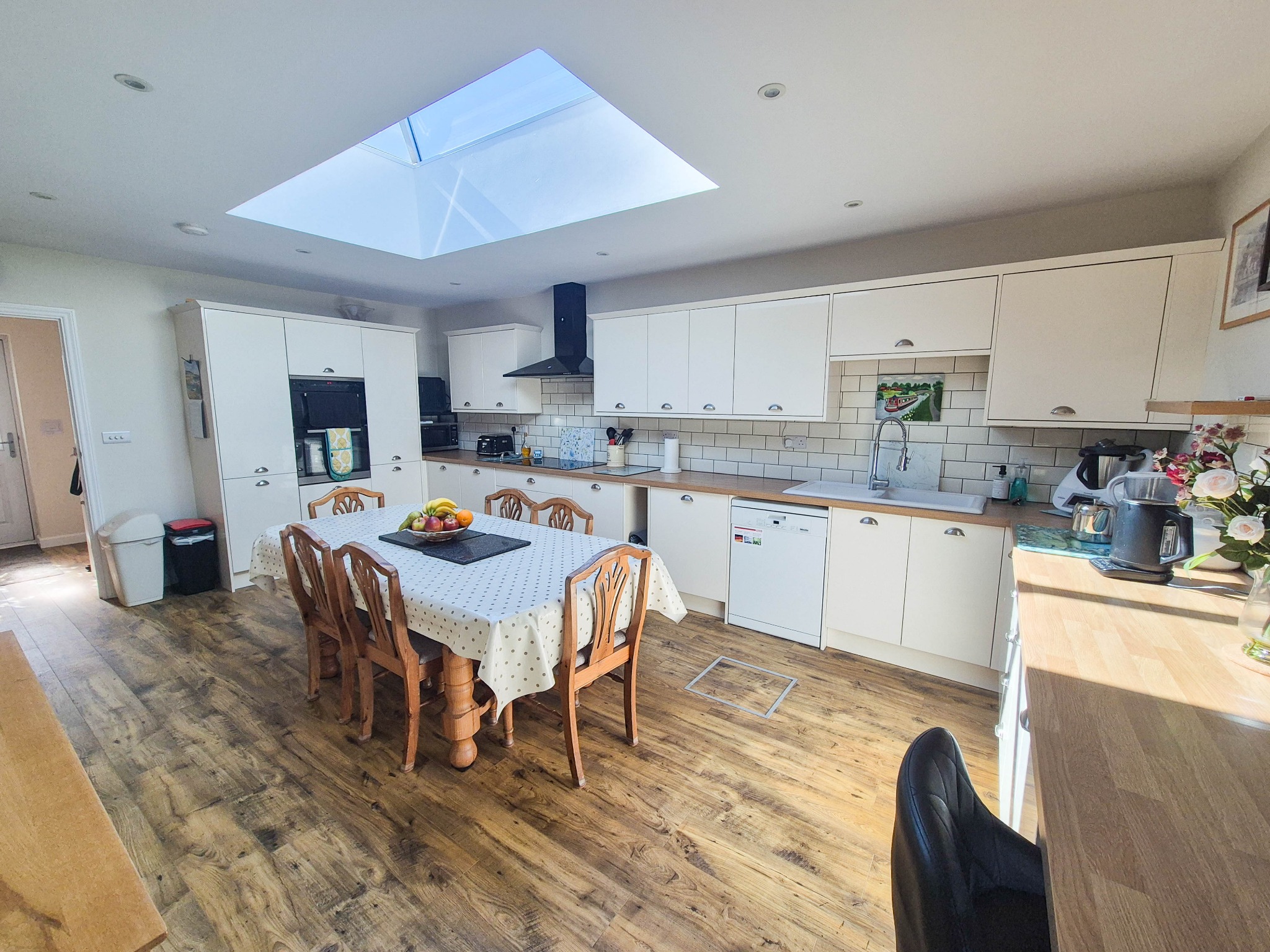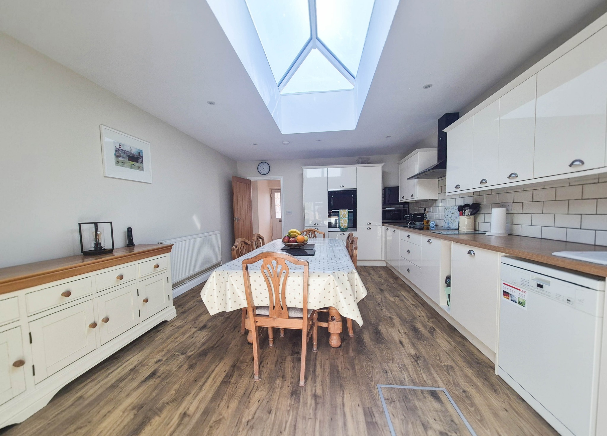 KITCHEN AREA: Comprising inset enamel sink, range of work surfaces incorporating drawer and cupboard fitments, fitted eye-level wall cupboards with concealed work surface lighting under, cooking station five burner ceramic hob with canopy over incorporating extractor and light. Split-level double oven with storage above and below and full height storage cupboards either side. Space and plumbing for dishwasher. Feature lantern roof window. Radiator.