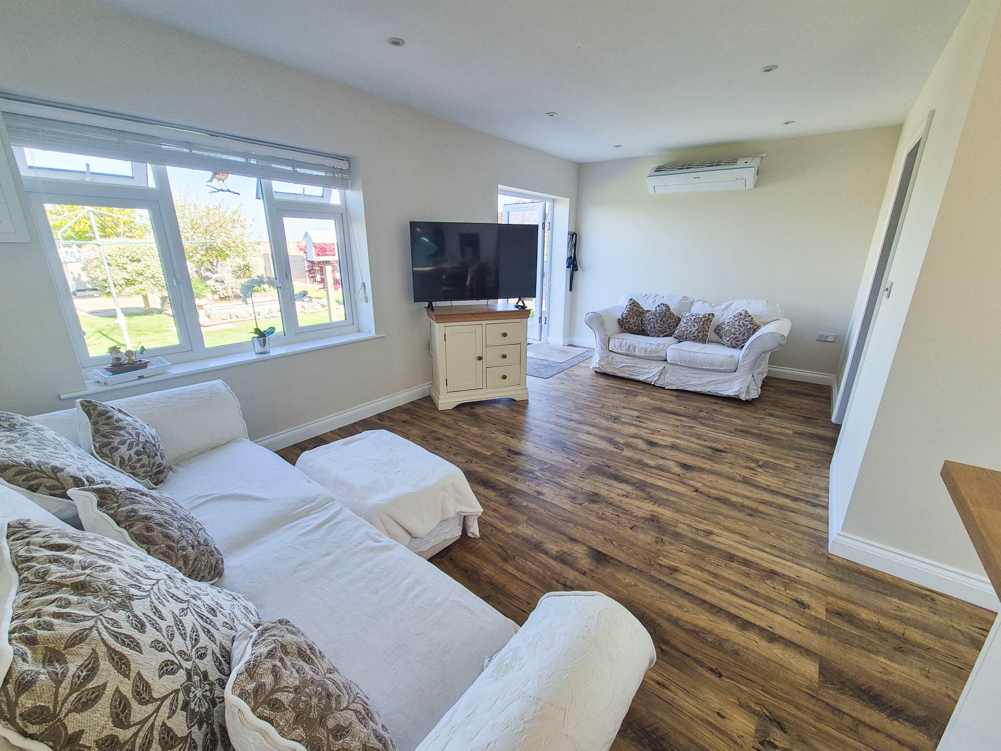SITTING AREA enjoys a pleasant aspect over the rear garden and has the benefit of air conditioning. UPVC double doors leading to terrace and lawn beyond.
