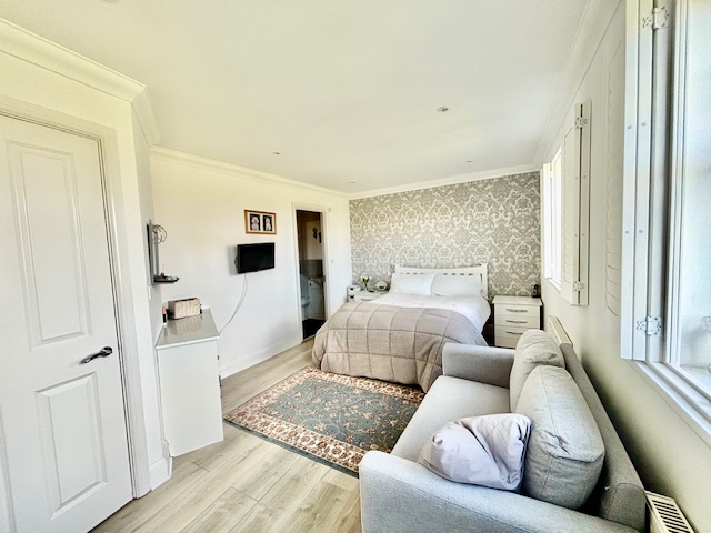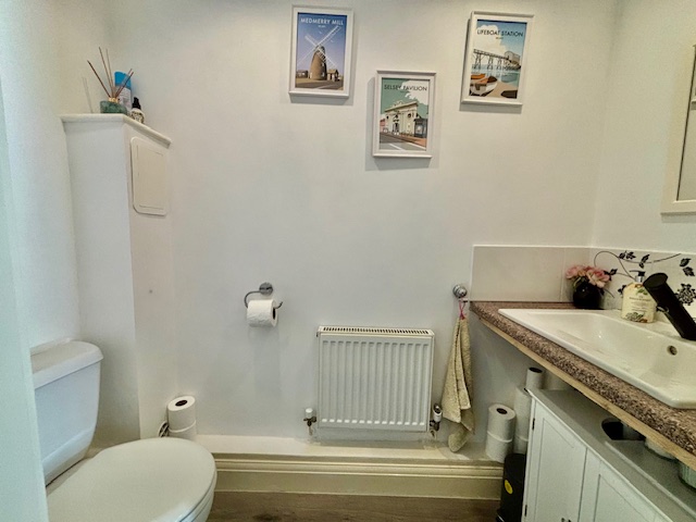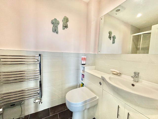 ENSUITE SHOWER ROOMHalf tiled with a white suite of fully tiled and enclosed shower cubicle with mains fed shower. Closed couple WC and wash hand basin in vanity unit with cupboard below. Shaver point. Ladder style radiator. Vinyl flooring.