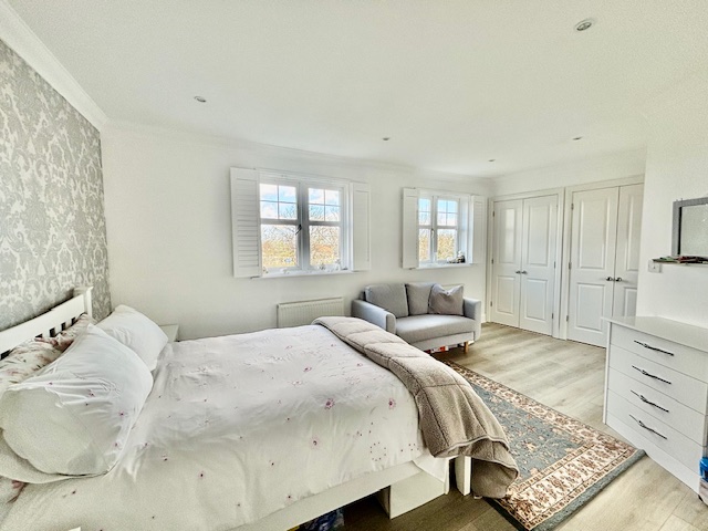 Maximum measurement but excludes twin built-in double wardrobe cupboards, with electric light providing hanging and shelved storage. Two single radiators. Telephone and television aerial points. LVT flooring.