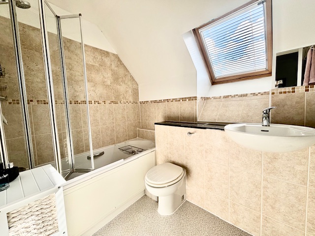 FAMILY BATHROOMComprising of a white suite of panelled bath in fully tiled surround with mixer/shower attachment and concertina glazed shower screen. Closed couple WC and wash hand basin in a half-tiled surround. Shaver point. Ladder style radiator. Vinyl flooring.