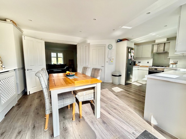 Fitted in a matching range of base and wall-mounted units in grey with complimentary work surfaces over and part tiling to walls, providing comprehensive cupboard and drawer storage. Inset single drainer stainless steel sink unit with mixer tap, space and plumbing below for automatic washing machine and slimline dishwasher. Inset four ring gas hob, glass splashback above and built-in electric double oven below with stainless steel extractor canopy over. Space for upright fridge freezer. One cupboard houses a recently installed Vaillant gas fired boiler, supplying central heating and domestic hot water - timer controls below. Bank of additional storage in the dining area with concealed double radiator. Television aerial point. French doors to rear garden. Door returning to entrance hall.