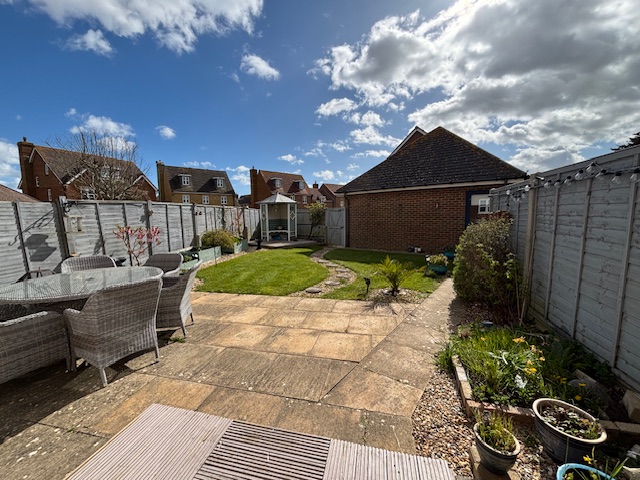 REAR GARDEN measuring approximately 32' (9.79m) x 30' (9.14) maximum measurement being of irregular shape. A paved patio adjacent to the property with external lighting and standpipe leads onto a lawn with paved and gravelled surrounds and additional decked seating area to the rear. Gated pedestrian access to the driveway.