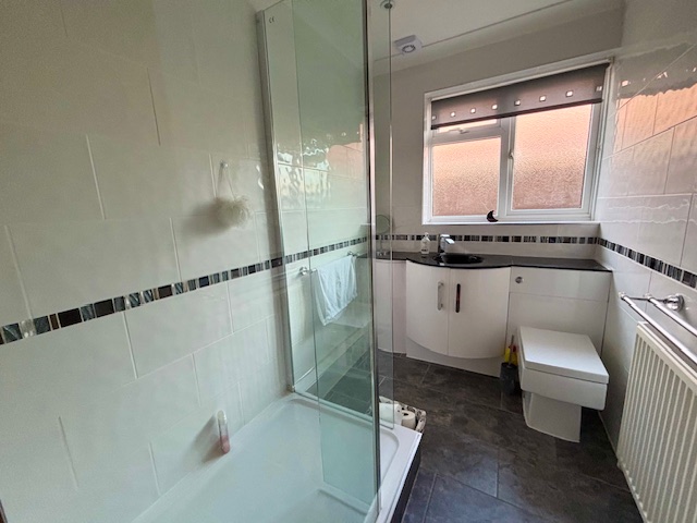 SHOWER ROOMFully tiled. White suite of enclosed shower cubicle with mains fed shower, oval wash hand basin in laminate surround with with cupboards and drawers below, close-couple WC. Ladder-style radiator. Ceramic tiled floor.
