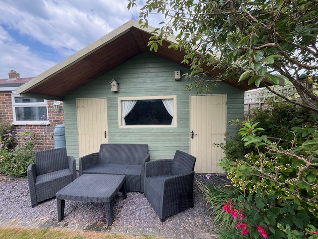CEDARWOOD SUMMER HOUSE 14'10 (4.52m) x 9'7 (2.92m) internal, with electric light and power.