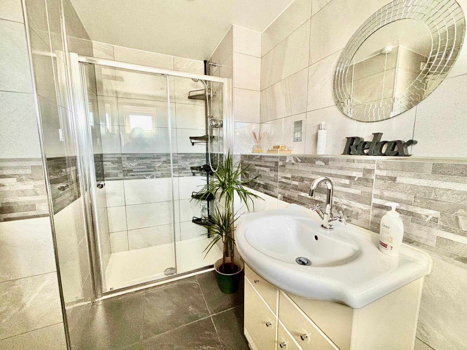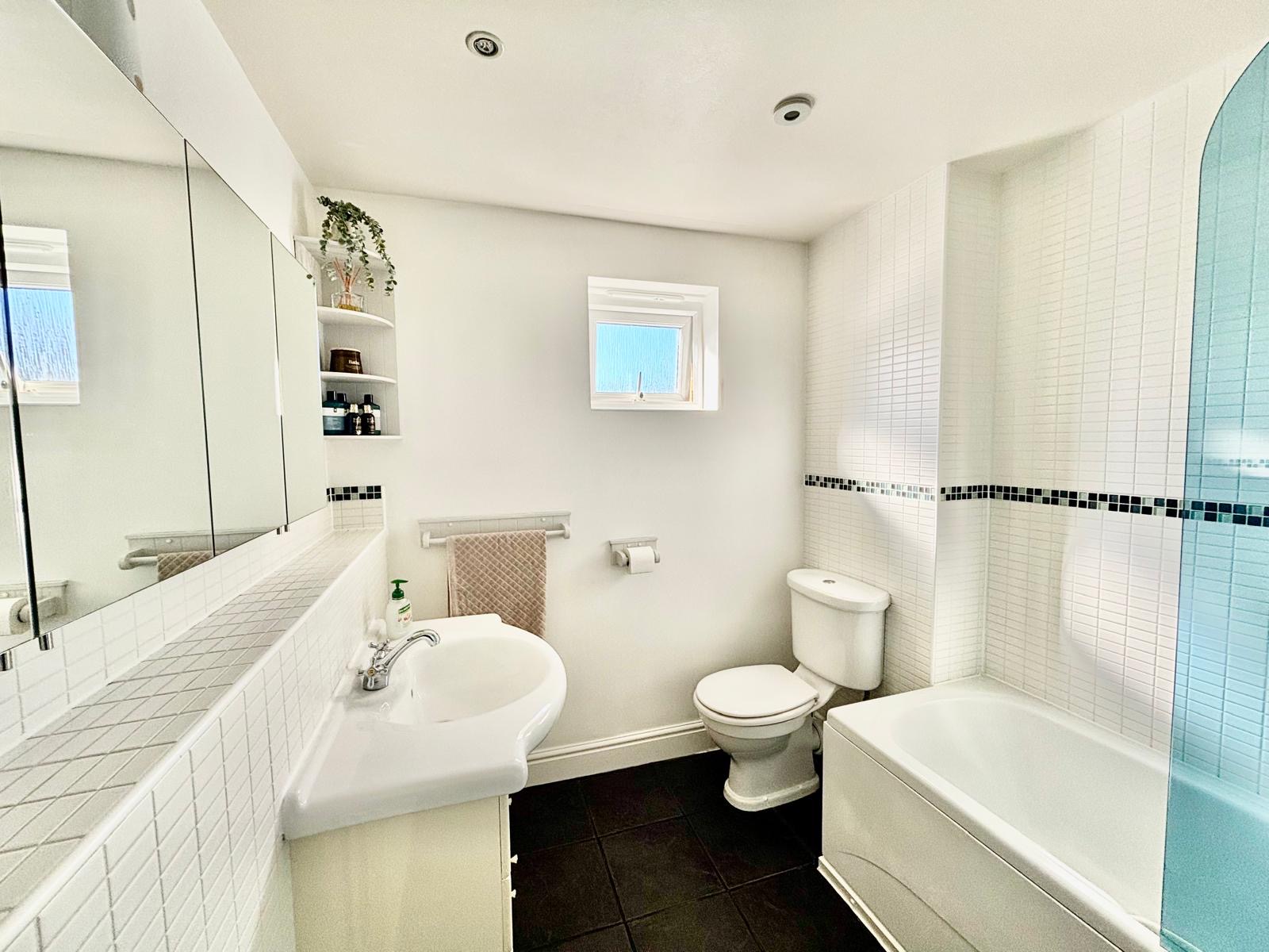 Part-tiling to walls. White suite of panelled bath with mixer tap over and glazed shower screen, low level WC and wash hand basin with cupboard storage below. Wall mounted mirror-fronted storage cabinet. Shaver point. Radiator. Tiled floor.