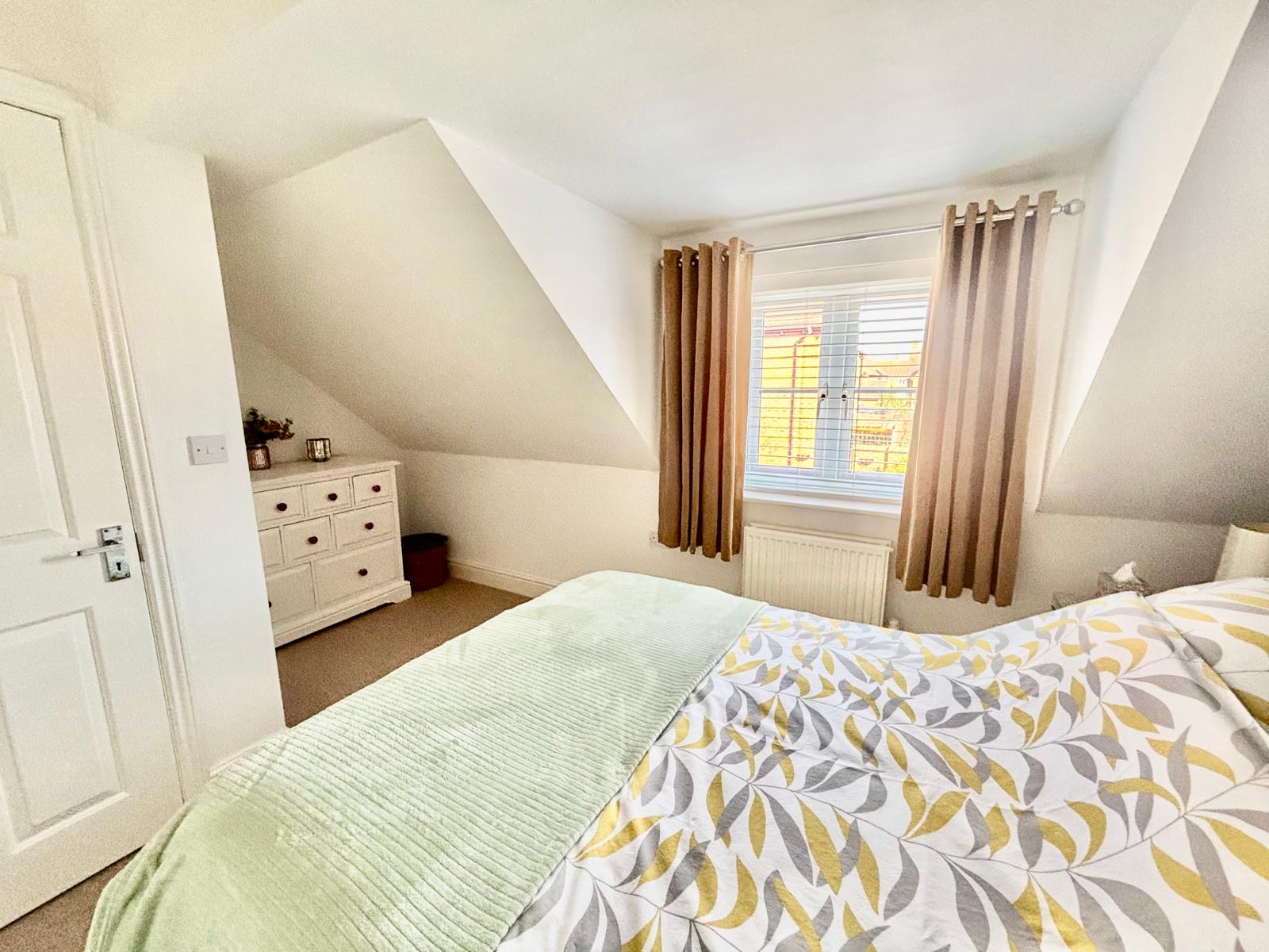 Dual aspect. Radiator. Built-in twin double wardrobes with hanging rail and shelf above.
