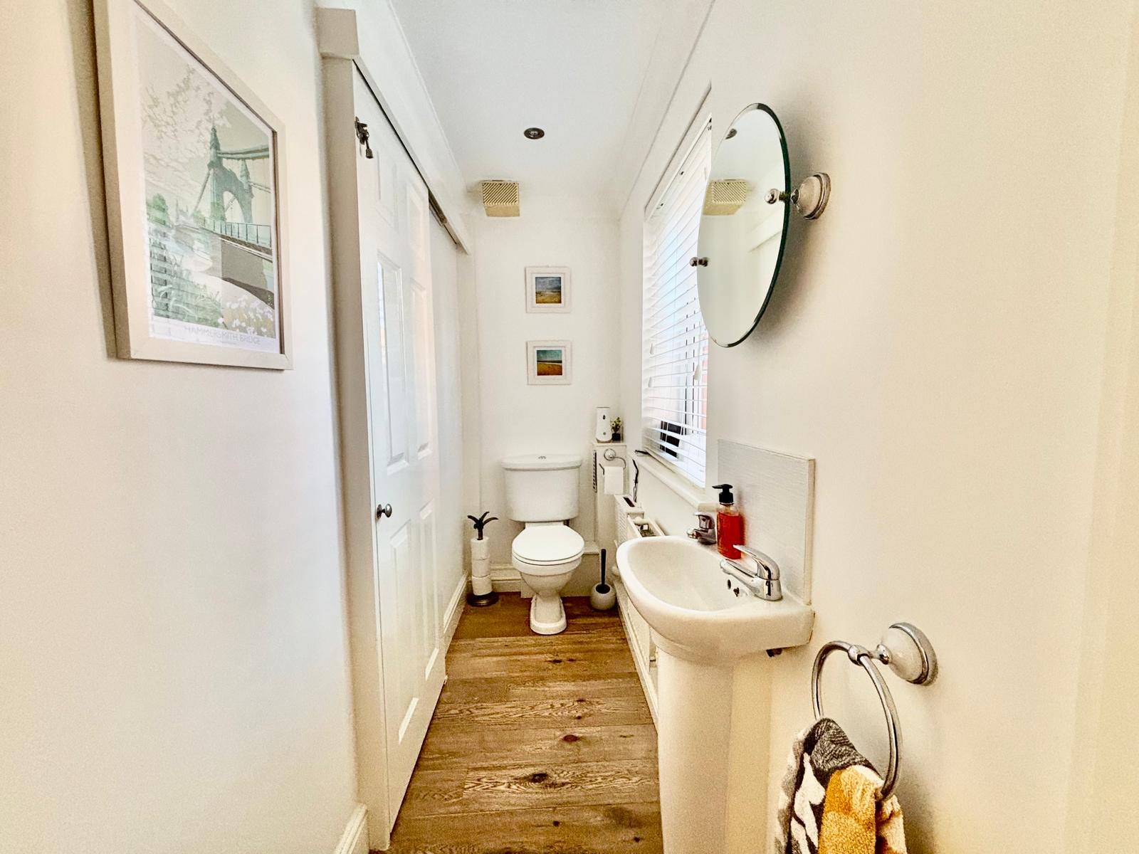 CLOAKROOMWhite suite of low level WC and wash hand basin. Sliding door to generous storage cupboard. Radiator.