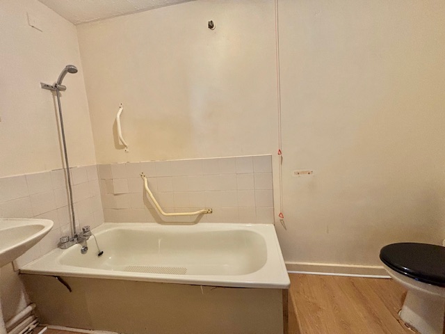 BATHROOMComprises of a coloured suite of panelled bath in tiled surround with mixer/shower attachment, a low level WC and pedestal wash hand basin with tiled splashback. Light and shaver point. Wood laminate flooring.