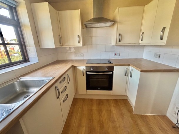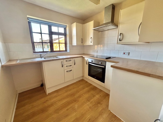 Fitted in a matching range of base and wall mounted units in cream shaker style with brushed stainless steel handles providing cupboard and drawer storage and having wood effect roll edge work surfaces over and part tiling to walls. Inset single drainer stainless steel sink unit with mixer tap. Space and plumbing below for automatic washing machine. Inset four ring ceramic hob with built-in electric oven below and three speed stainless steel extractor canopy above. Space for upright fridge/freezer. Wood laminated flooring.