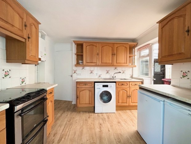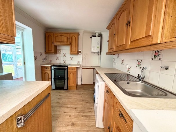 Fitted in a matching range of base and wall-mounted units in mid-oak with roll edge work surfaces over and part tiling to walls. Inset single drainer stainless steel sink unit with mixer tap, space and plumbing below for automatic washing machine. Under work surface space for refrigerator and freezer. Space for gas/electric cooker. Wall-mounted glow-worm gas-fired boiler supplying central heating and domestic hot water. Vinyl flooring. Door to garden room and sliding door to:-