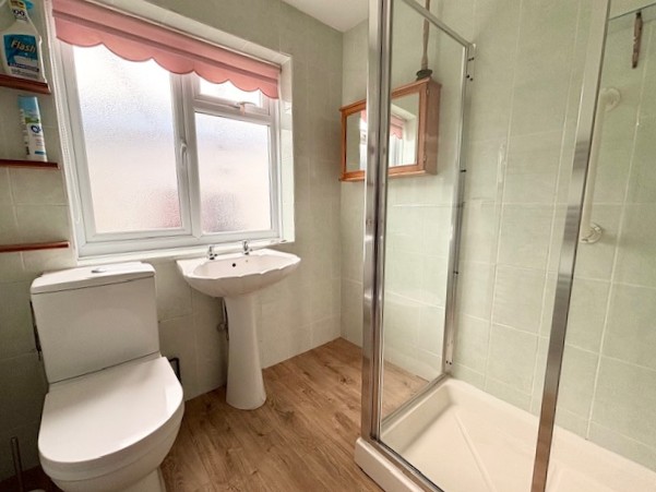 SHOWER ROOMFully tiled with a white suite of double shower enclosure with Mira electric shower. Pedestal wash hand basin. Low level WC. Ladder style radiator. Vinyl flooring.