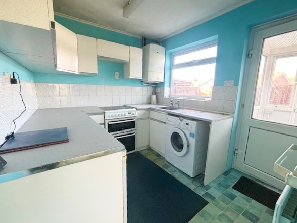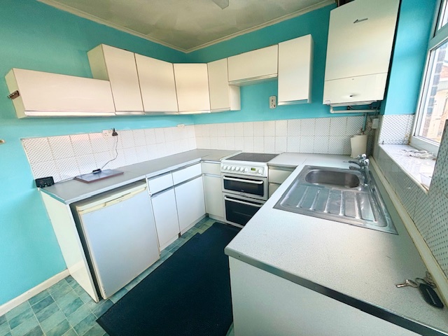 Fitted in a range of original base and wall-mounted units providing cupboard and drawer storage with mottled work surfaces over and part tiling to walls. Inset single drainer stainless steel sink unit. Space and plumbing for automatic washing machine to side. Under work surface space for refrigerator, space for electric cooker. Built-in shelved pantry cupboard. Wall-mounted Worcester gas-fired combination boiler supplying central heating and domestic hot water. Single radiator. Door to:-
