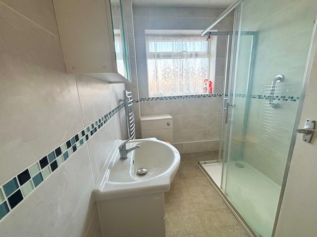 SHOWER ROOMFully tiled with a white suite of enclosed double shower cubicle with mains fed shower. Close coupled WC. Wash hand basin with cupboard below. Ladder style radiator. Built-in shelved linen cupboard with single radiator.