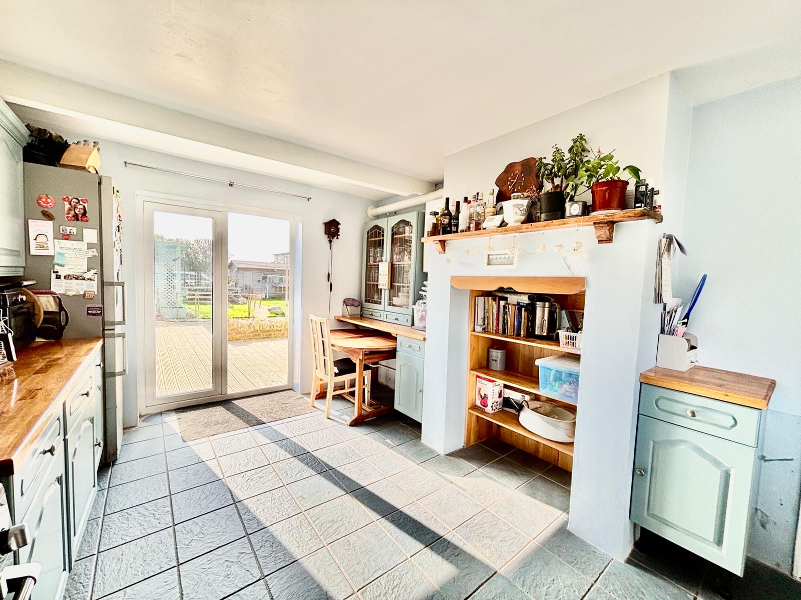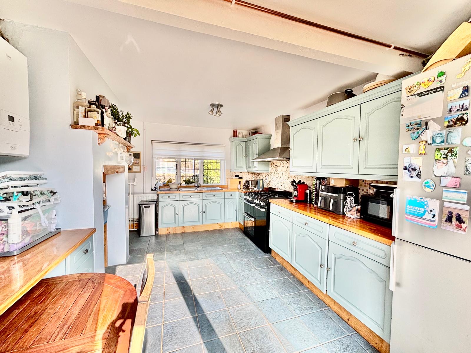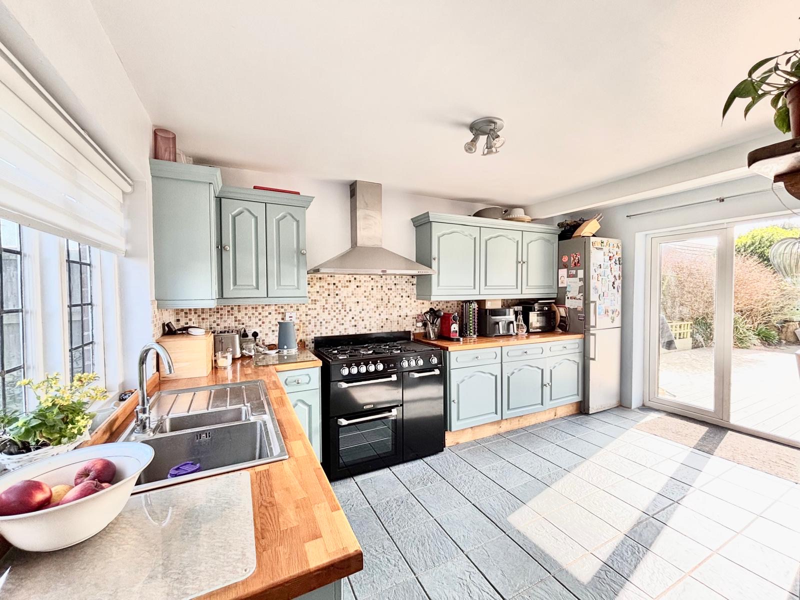 Measurement is to either side of the chimney breast. Fitted in a matching range of blue 'Shaker' style base and wall mounted units providing comprehensive cupboard and drawer storage; wooden work surfaces over. Inset one and a half bowl stainless steel sink unit and mixer tap, integrated dishwasher and washing machine below. Free-standing Range cooker with seven-burner gas hob and extractor hood above. Space for free-standing fridge/freezer. Built-in breakfast bar with display cabinet over plus additional shelving. Part-tiling to walls. Tiled floor. French doors to rear garden. Wall mounted Ideal boiler, newly installed in 2025 and supplying central heating and domestic hot water.