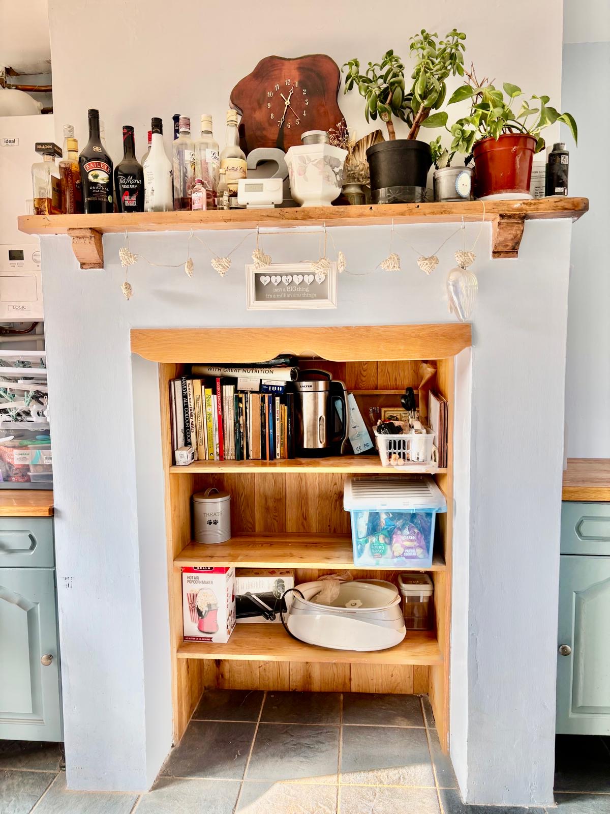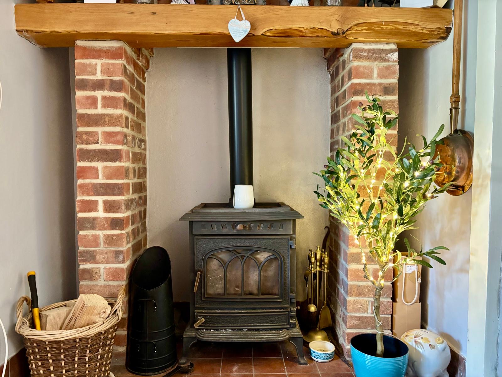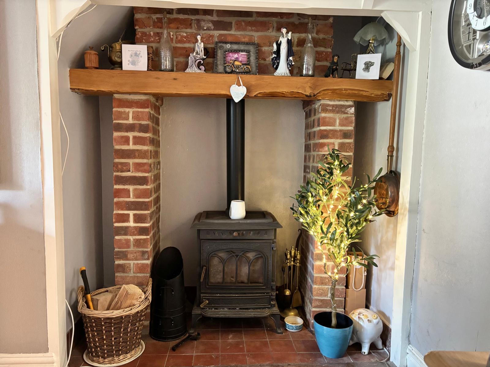 Measurement is to either side of the chimney breast. Fitted in a matching range of blue 'Shaker' style base and wall mounted units providing comprehensive cupboard and drawer storage; wooden work surfaces over. Inset one and a half bowl stainless steel sink unit and mixer tap, integrated dishwasher and washing machine below. Free-standing Range cooker with seven-burner gas hob and extractor hood above. Space for free-standing fridge/freezer. Built-in breakfast bar with display cabinet over plus additional shelving. Part-tiling to walls. Tiled floor. French doors to rear garden. Wall mounted Ideal boiler, newly installed in 2025 and supplying central heating and domestic hot water.