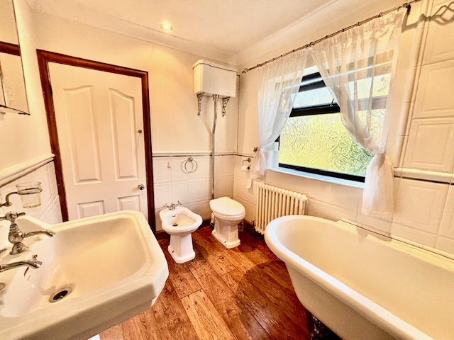 Half tiled Victorian style suite, claw foot bath in fully tiled surround with mains-fed shower. High level w/c. Bidet. Pedestal wash hand basin. Radiator. Wood laminate flooring.