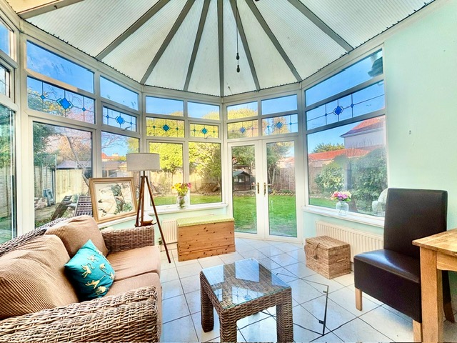 Dwarf cavity wall construction, UPVC double glazed elevations and a pitched Victorian style polycarbonate roof fitted with ceiling light fan. Radiator. Ceramic tiled floor. French doors to garden.