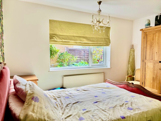 Double aspect. French doors to the rear garden. Measurement includes a fitted corner wardrobe cupboard with drawer unit to side. Single radiator.