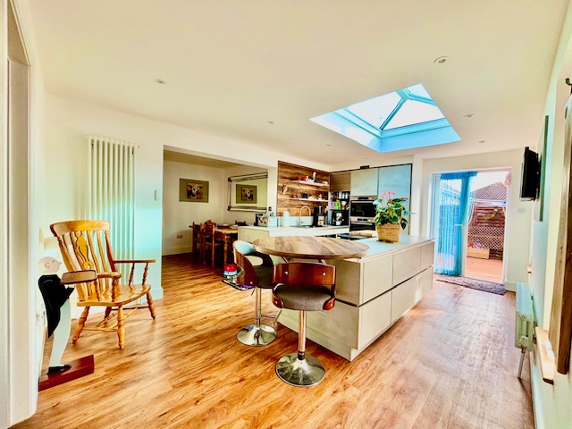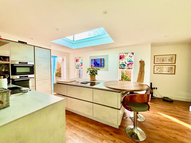 A bright and airy double aspect room with French doors to the rear garden and a central ceiling lantern light with remote control blinds fitted. The kitchen is fitted in a contemporary range of units with a central island comprehensively fitted with drawer storage, housing an inset ceramic hob with fitted extractor fan. Extending to a circular breakfast bar seating area, Inset single drainer sink unit with Quooker tap, open shelving above with LED illumination. Integrated dishwasher to side. Built-in double oven in upright housing unit, cupboards above and below. Integrated fridge freezer to side. Two radiators. Television aerial point.