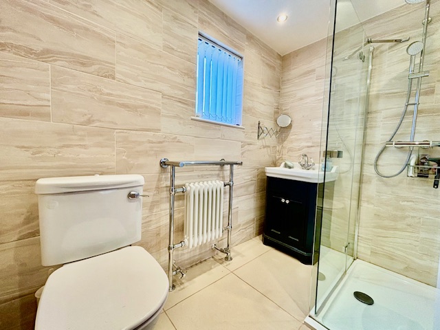SHOWER ROOMFully tiled with a white suite of double shower cubical with mains fed shower. Low level WC. Wash hand basin with cupboard below. Radiator with heated towel rail. Ceramic tile floor.