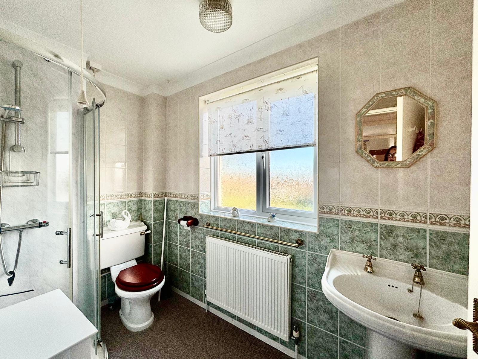 SHOWER ROOMWhite suite comprising of an enclosed corner shower cubical with mains-fed shower. Low level WC and pedestal wash hand basin. Fully tiled walls. Radiator.