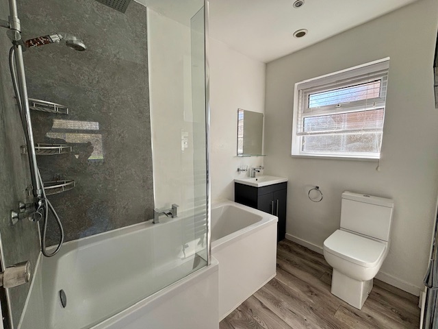 BATHROOMA white suite of shaped shower-bath in fully tiled surround with mains fed shower and glazed shower screen. Wash hand basin with cupboard below. Low level WC. Ladder style radiator.