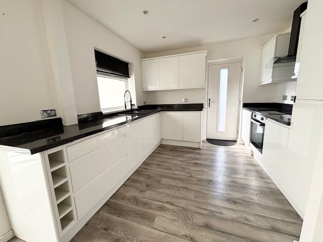 Fitted in a range of base and wall-mounted units in white high gloss with complementary work surfaces and up stands over. Inset single drainer composite sink unit with mixer tap. Inset a four-ring ceramic hob with built-in electric oven below and extractor canopy above. Integrated automatic washing machine to side and integrated fridge freezer. Composite door to driveway and garden. Inset LED ceiling lights.
