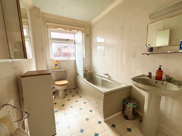 Measurement excludes the door recess, fully tiled with a coloured suite of panelled bath with telephone style mixer/shower attachment and glazed shower screen. Low level WC. Pedestal wash hand basin. Single radiator.