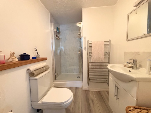 ENSUITEWhite suite of fully tiled and enclosed double shower cubicle with mains fed shower. Low level WC. Wash hand basin with cupboard below. Ladder style radiator.