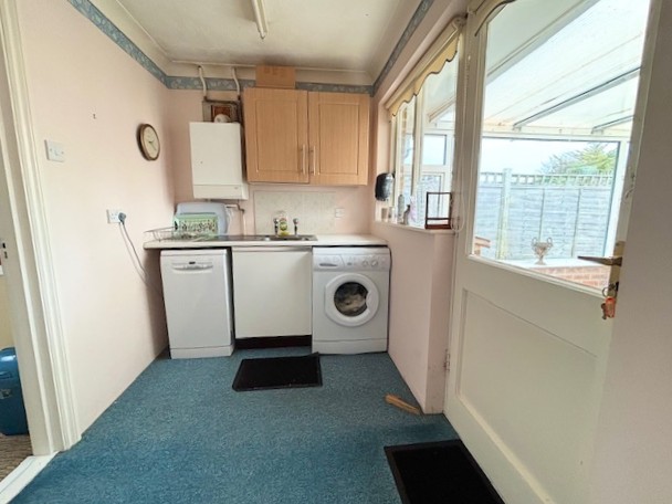 Roll edge work surface to one wall with inset single-drainer stainless steel sink unit. Space and plumbing beneath for automatic washing machine and dishwasher. Twin wall-mounted cupboards above, plus a wall-mounted Main gas-fired boiler supplying central heating and hot water. Door to bedroom two. Half glazed door to:-