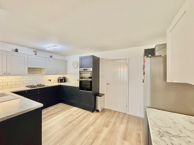 Fitted in a range of base and wall mounted units in navy blue and grey. Marble effect work surfaces over and part tiling to walls providing comprehensive cupboard and drawer storage with a tall upright larder-style cupboard. Inset single drainer composite sink unit with mixer tap, integrated dishwasher below. Inset four-ring gas hob with extractor fan above, integrated automatic washing machine to side. Built-in electric double oven in upright housing unit with cupboards above and below. Space for an American-style fridge/freezer. Space for tumble dryer. Wood laminate flooring extending into:-