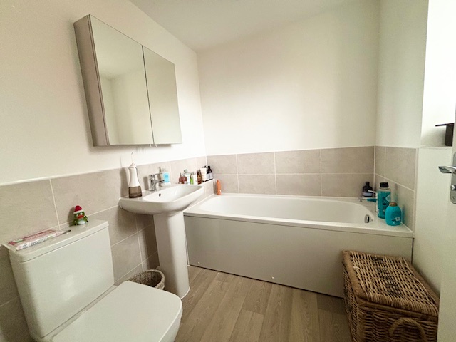 BATHROOMFitted with a modern suite of white panel bath in a tiled surround. Low-level WC. Pedestal wash hand basin with mixer tap over. Radiator. Part tiling to walls. Wood effect vinyl flooring.