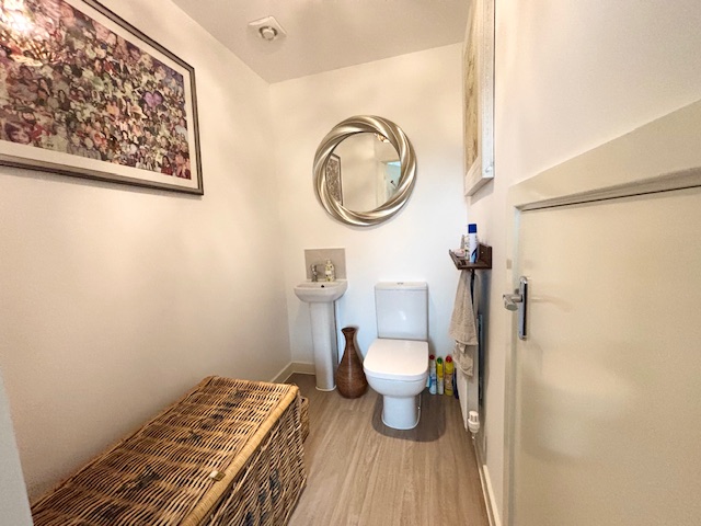 CLOAKROOMComprising a white suite of low-level WC and pedestal wash hand basin with mixer tap over. Tiled splash back. Deep under stairs storage cupboard. Radiator.