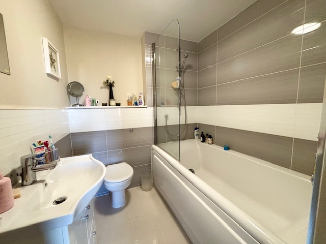 A modern fitted bathroom, white suite of deep bath in fully tiled surround with mixer tap and mains fed shower over. Glazed shower screen. Low-level WC and wash hand basin with mixer tap over, cupboard and drawer storage below. Tiled walls and flooring. Ladder style radiator.