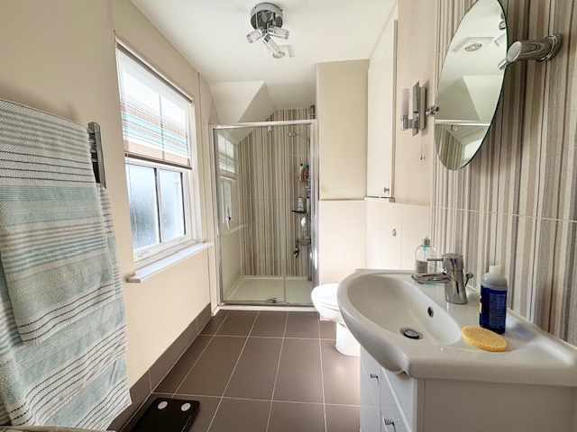 Maximum measurement. Built-in double shower cubicle in fully tiled surround with mains fed shower. White low-level WC and wash hand basin with storage cupboard below. Built-in storage cabinet to the side. Part tiling to walls. Tiled floor. Ladder style radiator.