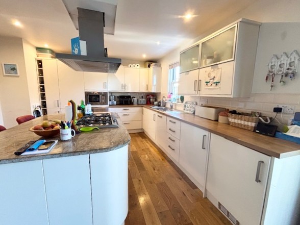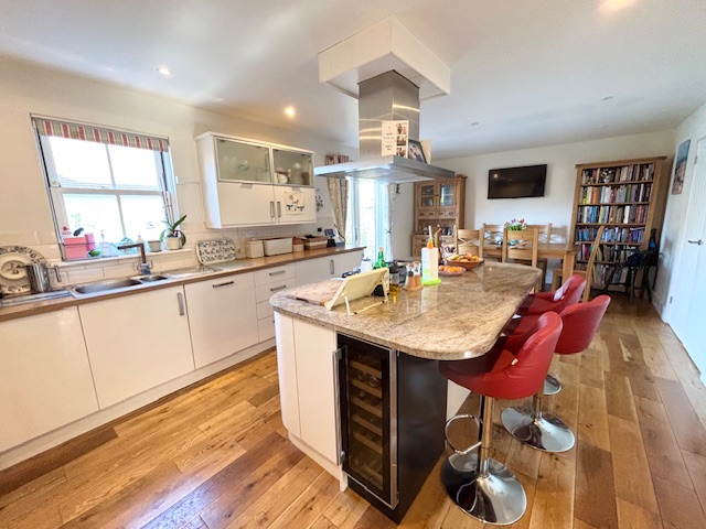Fitted in a range of high gloss base and wall-mounted units providing comprehensive cupboard and drawer storage with solid wood work surfaces over. Inset stainless steel 1½ bowl sink unit with mixer tap over. Eye level microwave in upright housing unit with warming drawer below. Integrated appliances including, dishwasher, washing machine, tumble dryer and fridge freezer. Central island in a matching range of units providing additional storage on all sides and housing a wine and drinks fridge. Complimentary quartz work surface over inset with a five-burner gas hob, built in double electric oven below and extractor hood over. Television aerial point. Part tiling to walls. Engineered oak flooring. Radiator. French doors to rear garden. Door to:-
