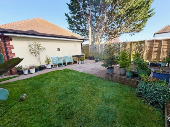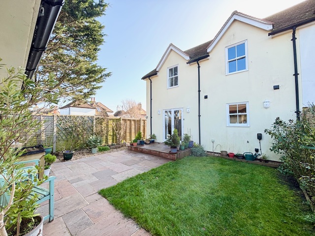 The front of the property is attractively bounded by flint and brick walling, with a step rising to the front door. Gated pedestrian access leads to the REAR GARDEN, which is fully enclosed by fencing, creating a private and secure space. A raised Indian sandstone patio adjoins the property — ideal for outdoor dining and entertaining — with the remainder laid to lawn and complemented by well-stocked borders planted with shrubs and seasonal flowers. The property also benefits from external lighting, EV charging point and external standpipe. A gate to the rear gives access to the allocated parking space and GARAGE
